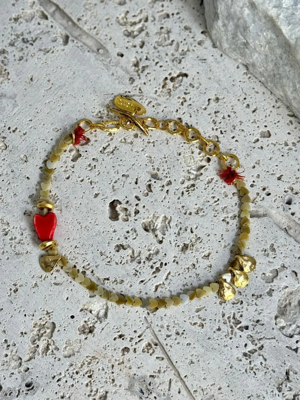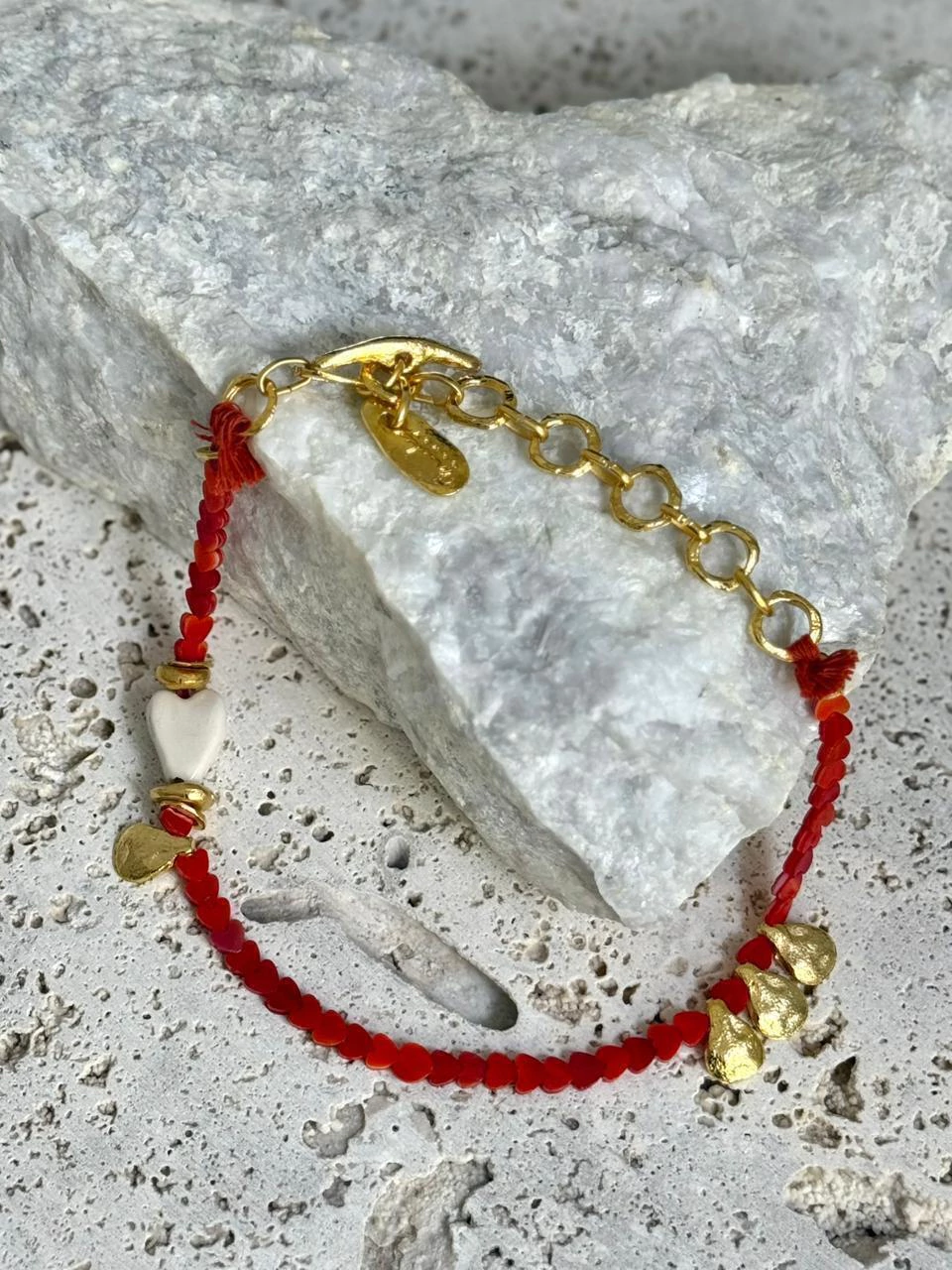 Collar de piedras en forma de corazón con eslabones bañados y dije de cerámica.