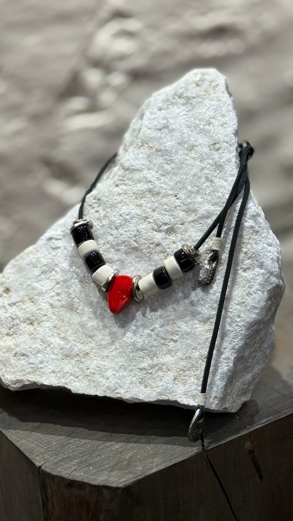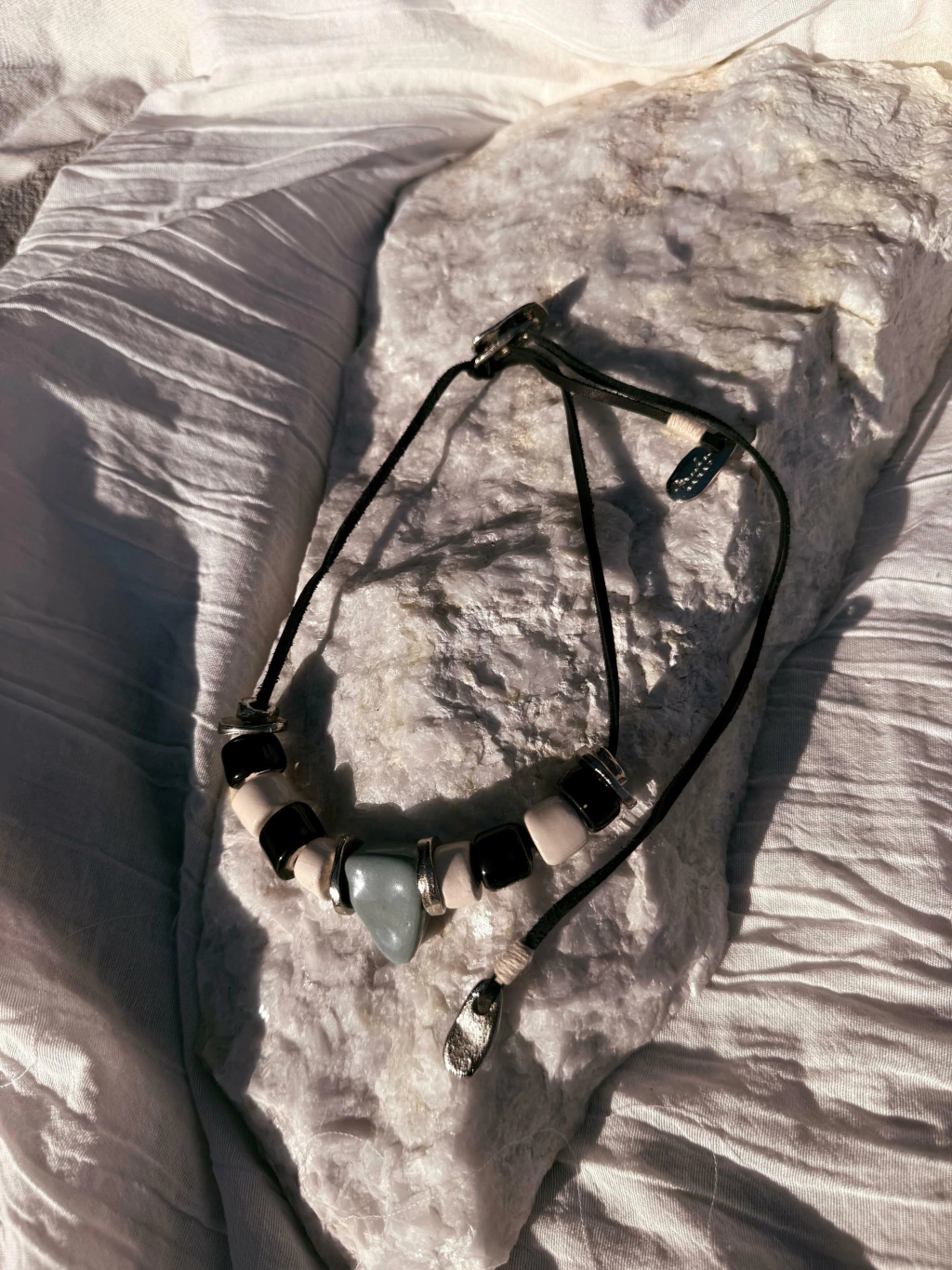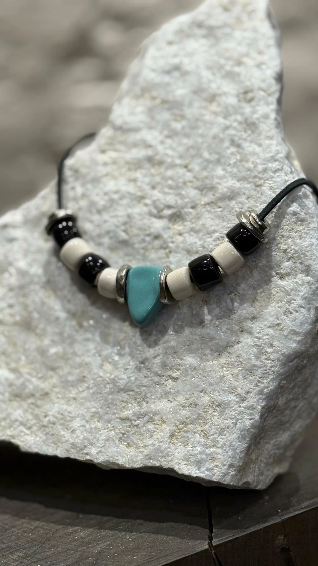 Collar con piezas de cerámica. Terminación de cuero, regulable.