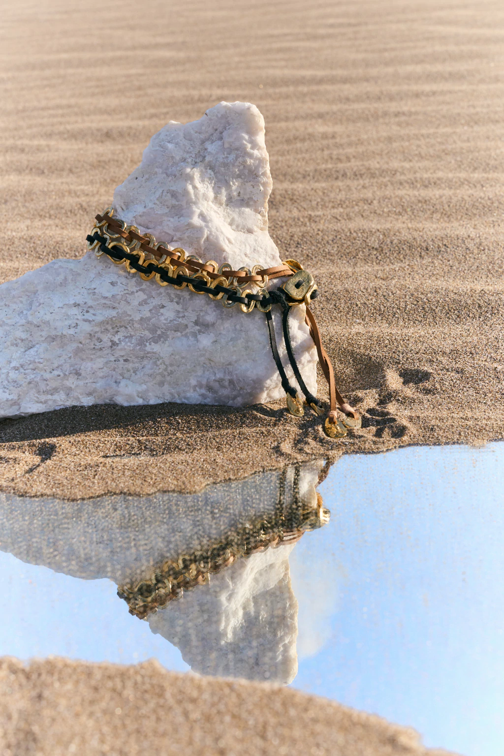 Collar con piezas bañadas en oro y terminación de cuero. Regulable.