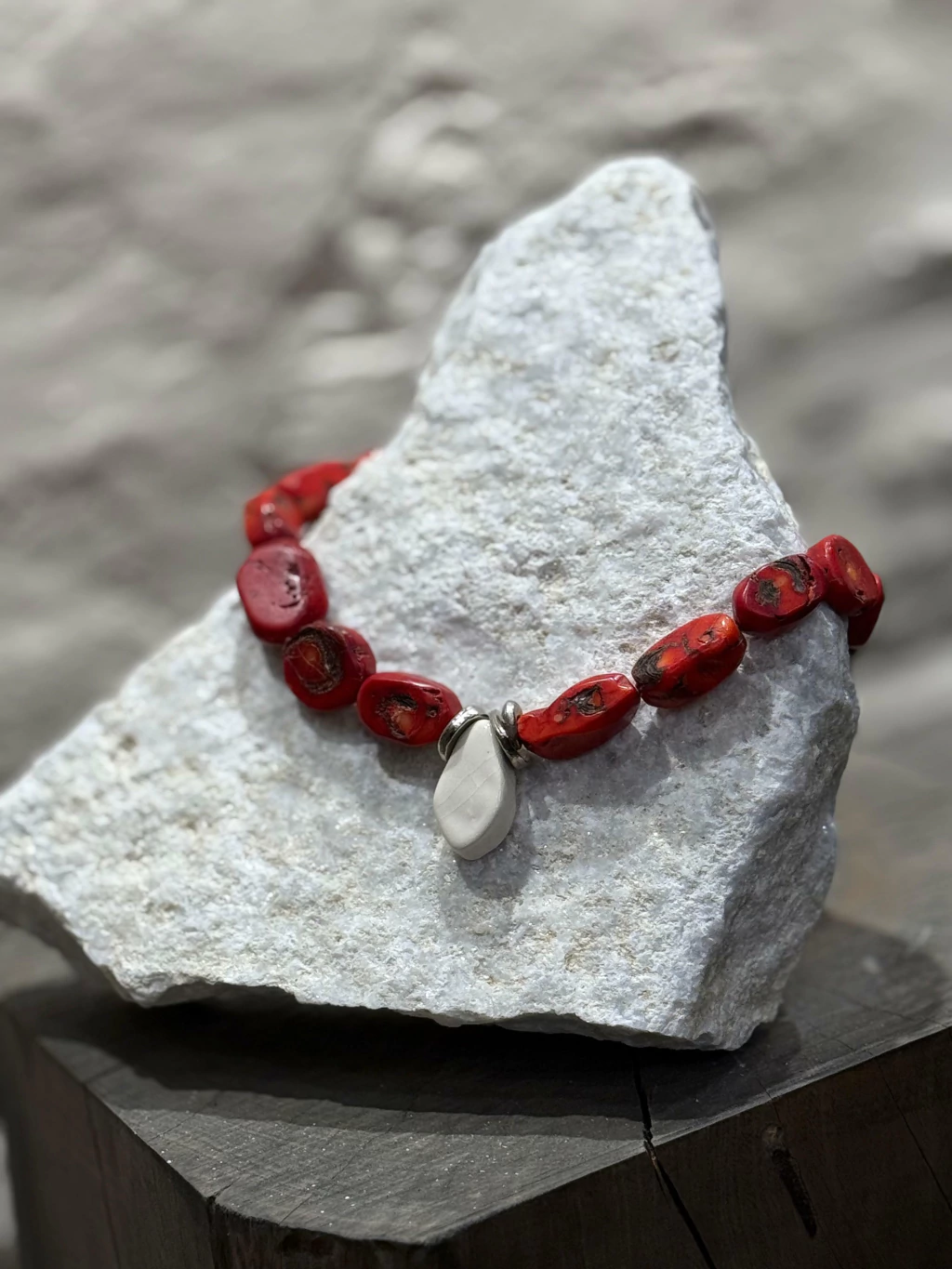 Collar de piedras reconstituidas con eslabones bañados y dije central de cerámica.