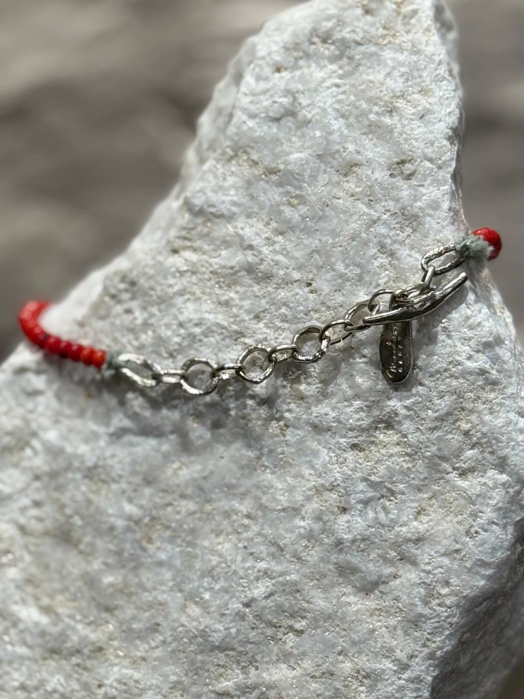 Collar de piedras rojas con terminaciónes de hilo y eslabones bañados.