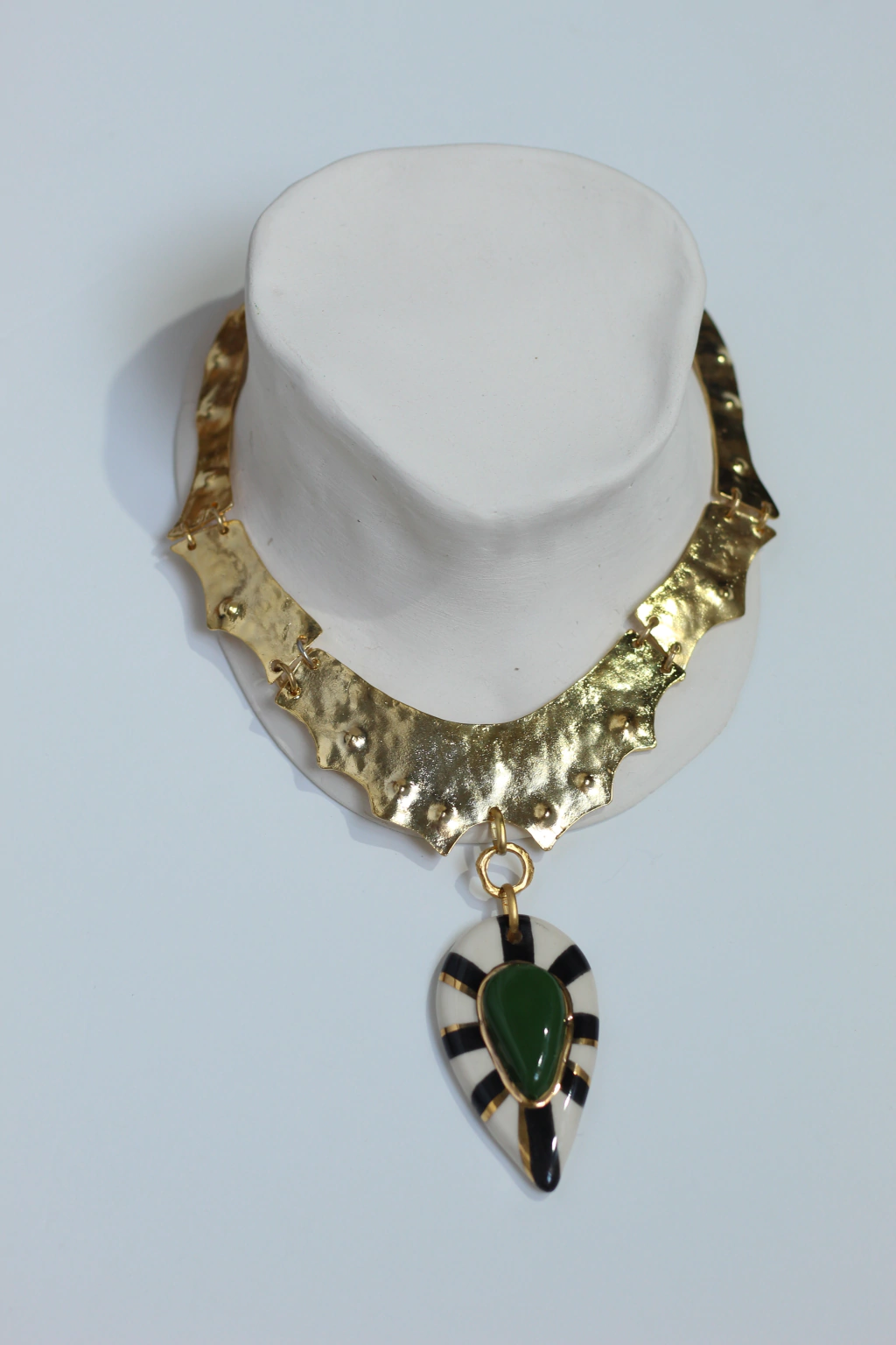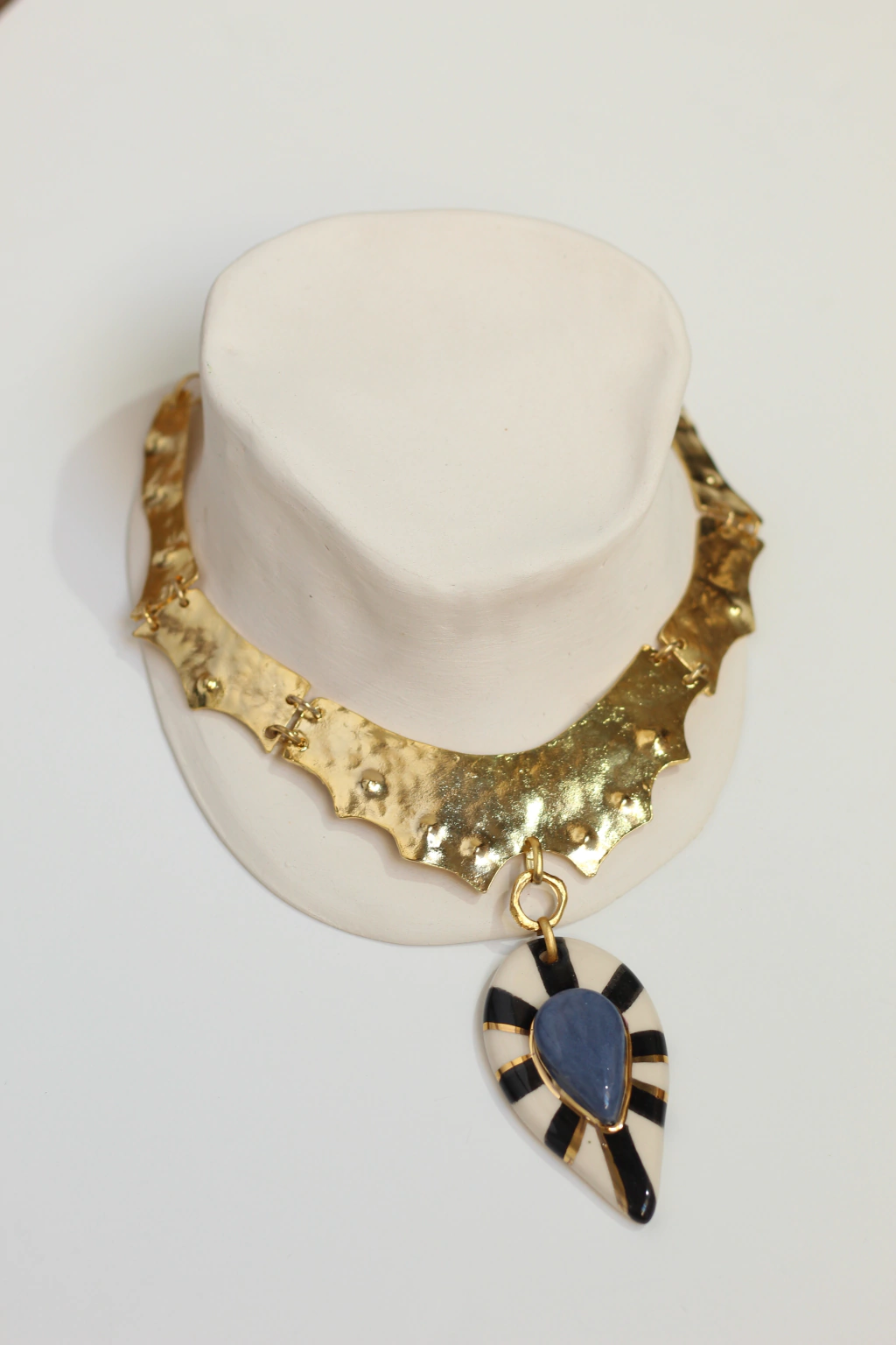 Collar metálico bañado en oro con pieza central de cerámica. Regulable.