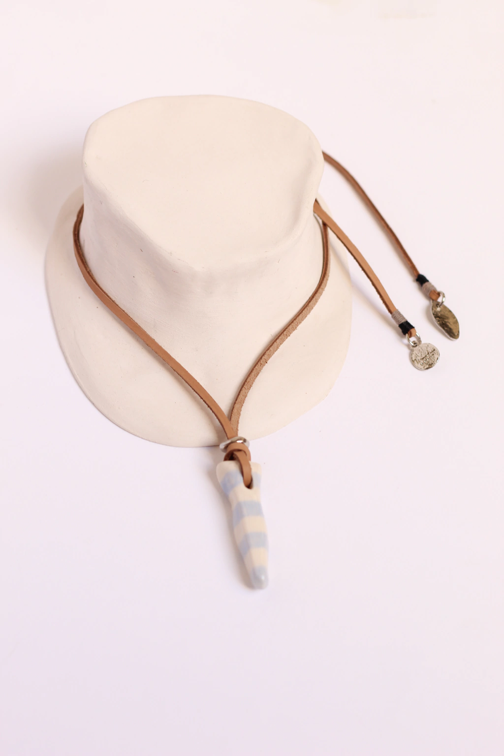 Collar tira de cuero con pieza de cerámica y terminaciones plateadas o bañadas en oro. Regulable.