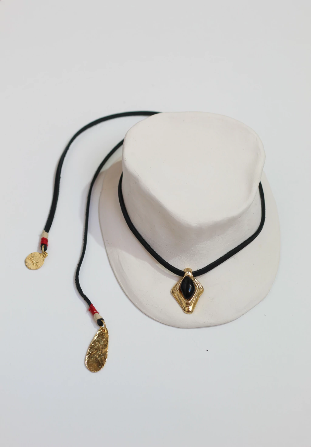 Collar con pieza bañadas en oro, cerámica y terminación de cuero. Regulable.