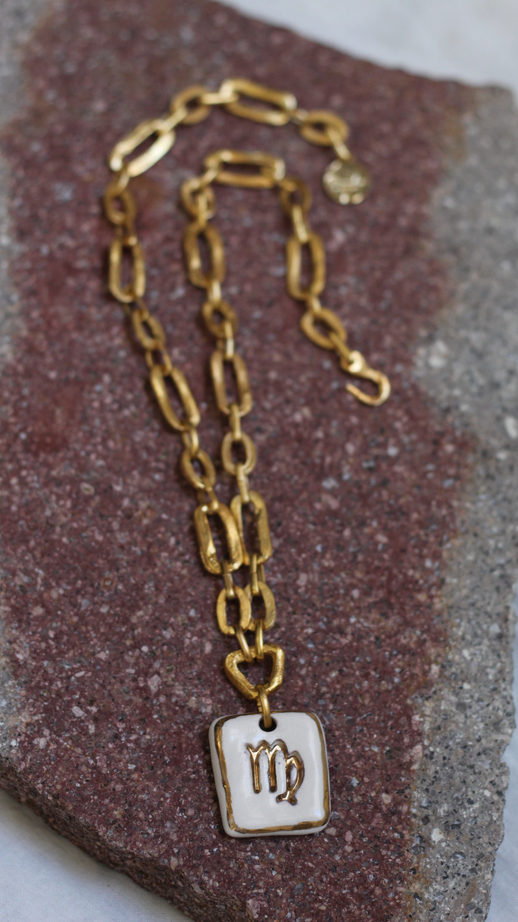 Collar de cadena bañada en oro con dije central de cerámica con signo del zodíaco en oro.