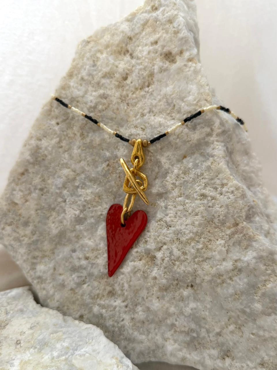 Collar de canutillo partido con terminaciones doradas e hilo de lino.
